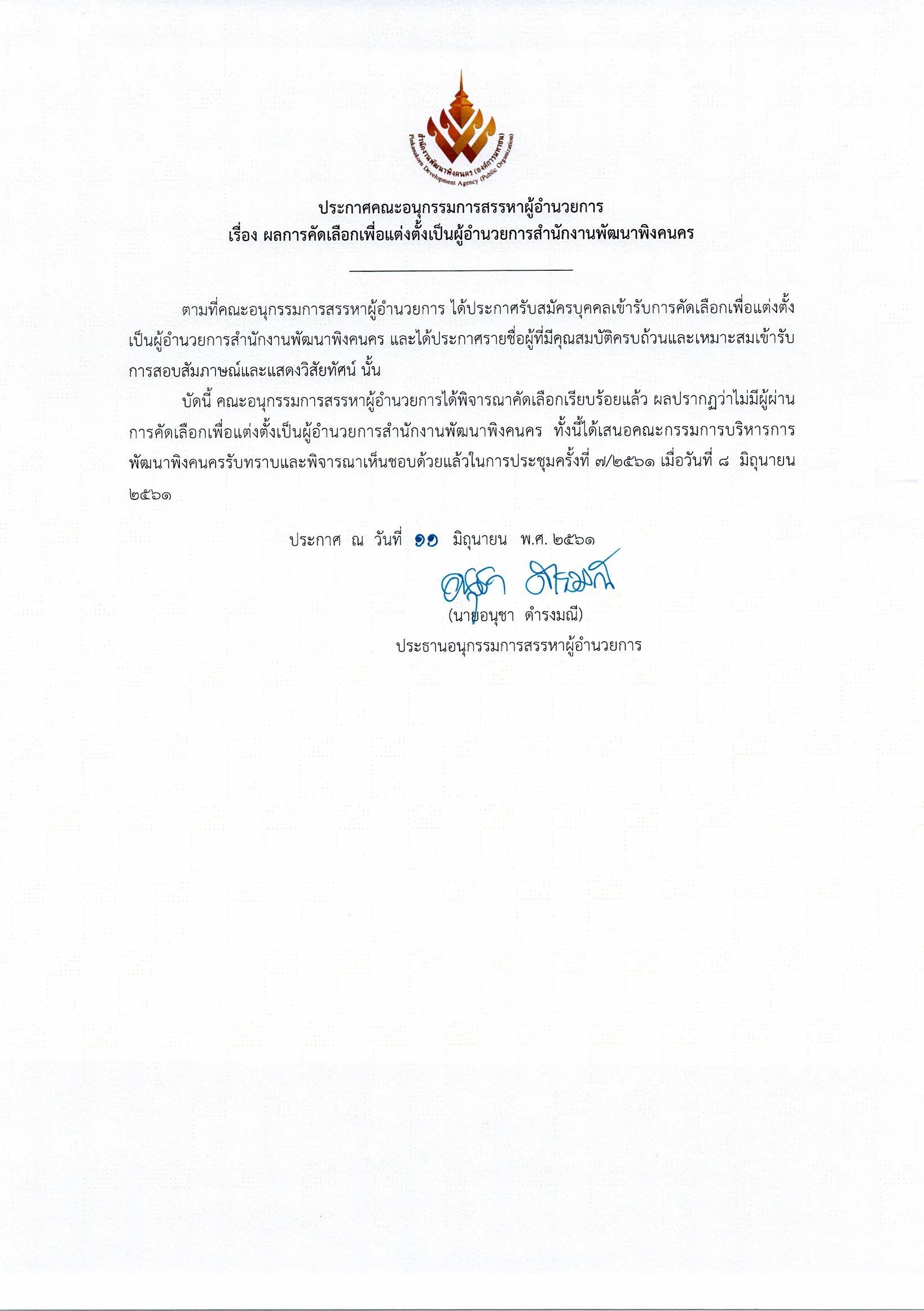 ประกาศ เรื่อง ผลการคัดเลือกเพื่อแต่งตั้งเป็นผู้อำนวยการสำนักงานพัฒนาพิงคนคร